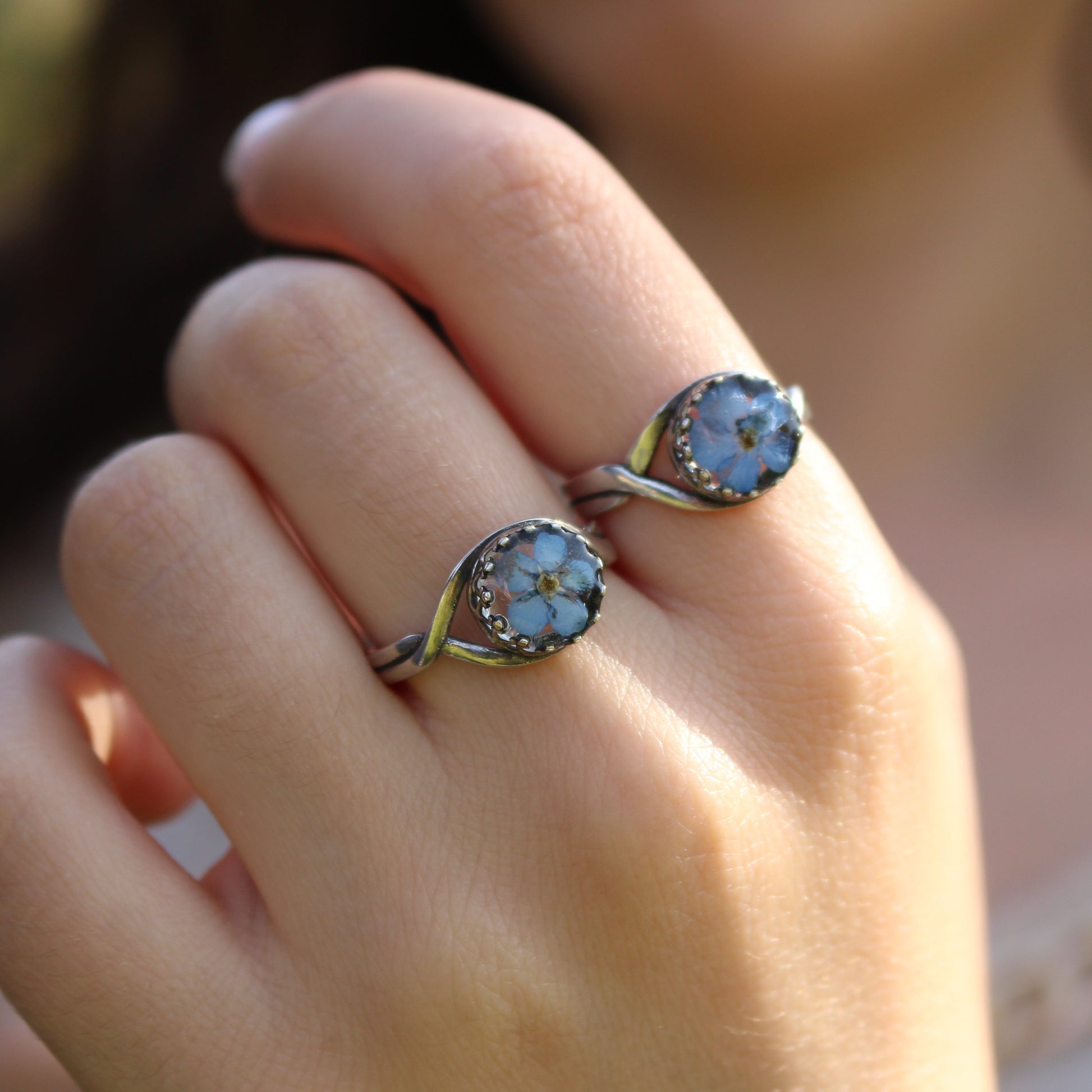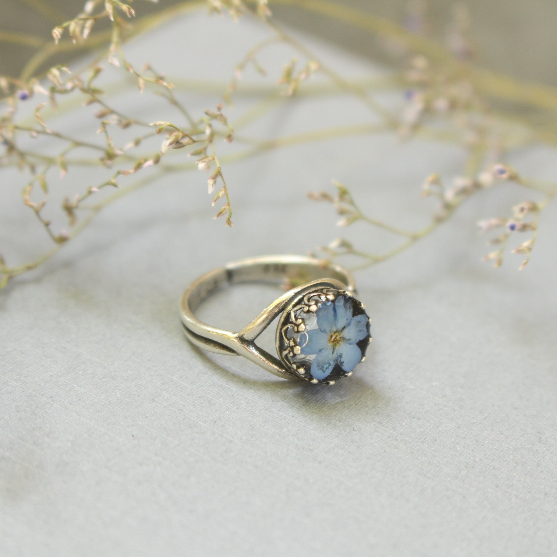 Այս մատանին պատրաստված է իրական անմոռուկ ծաղիկներով, որոնք պահպանված են թափանցիկ խեժի մեջ և տեղադրված հնաոճ արծաթափայլ լատունե հիմքի մեջ։