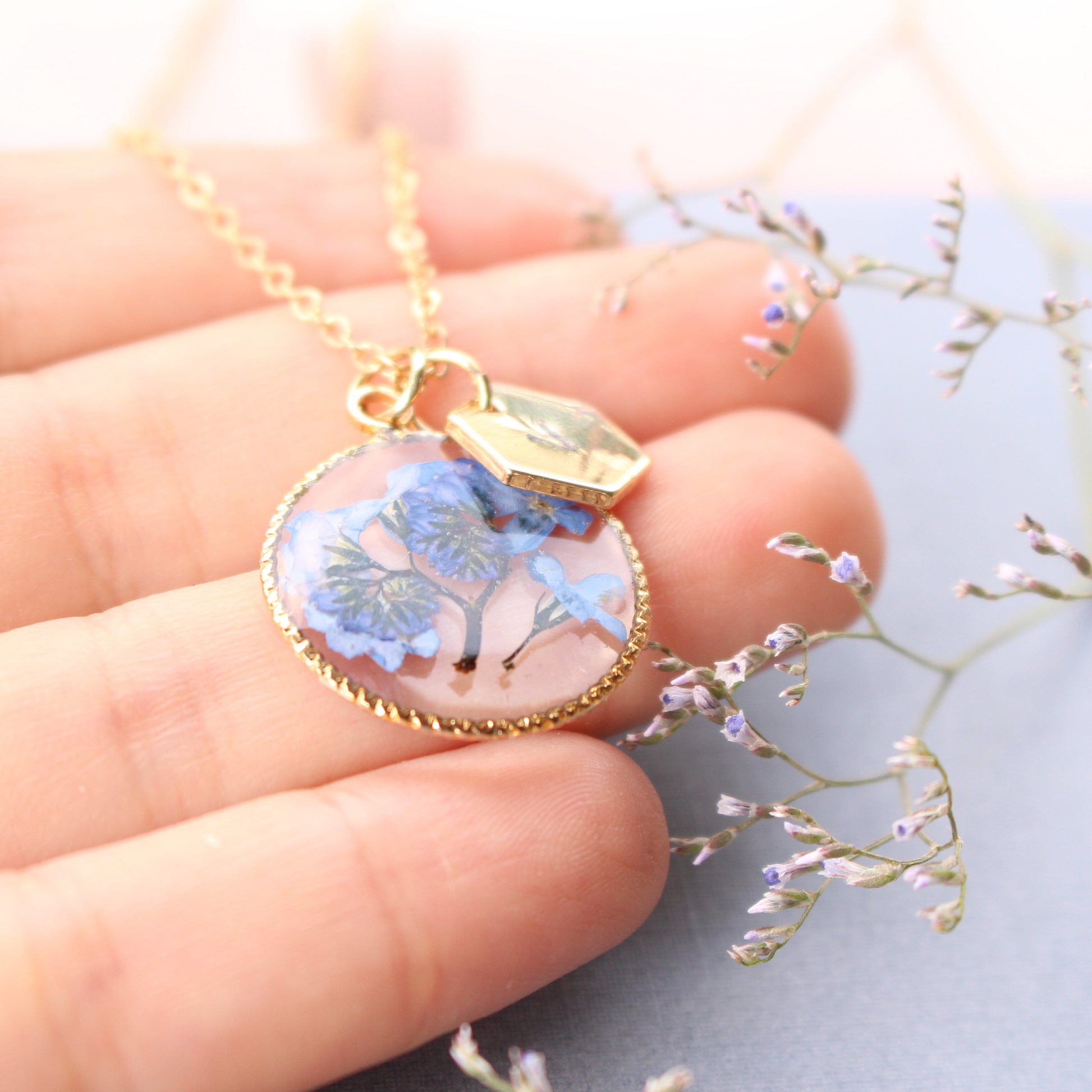Ձեռագործ վզնոց պատրաստված բնական նուրբ անմոռուկ ծաղիկներից, որոնք զգուշությամբ ծածկված են բարձրորակ խեժի ապահով շերտով։ Մետաղը ոսկեջրած լատուն է, չի խամրում և չի կորցնում նախնական տեսքը։