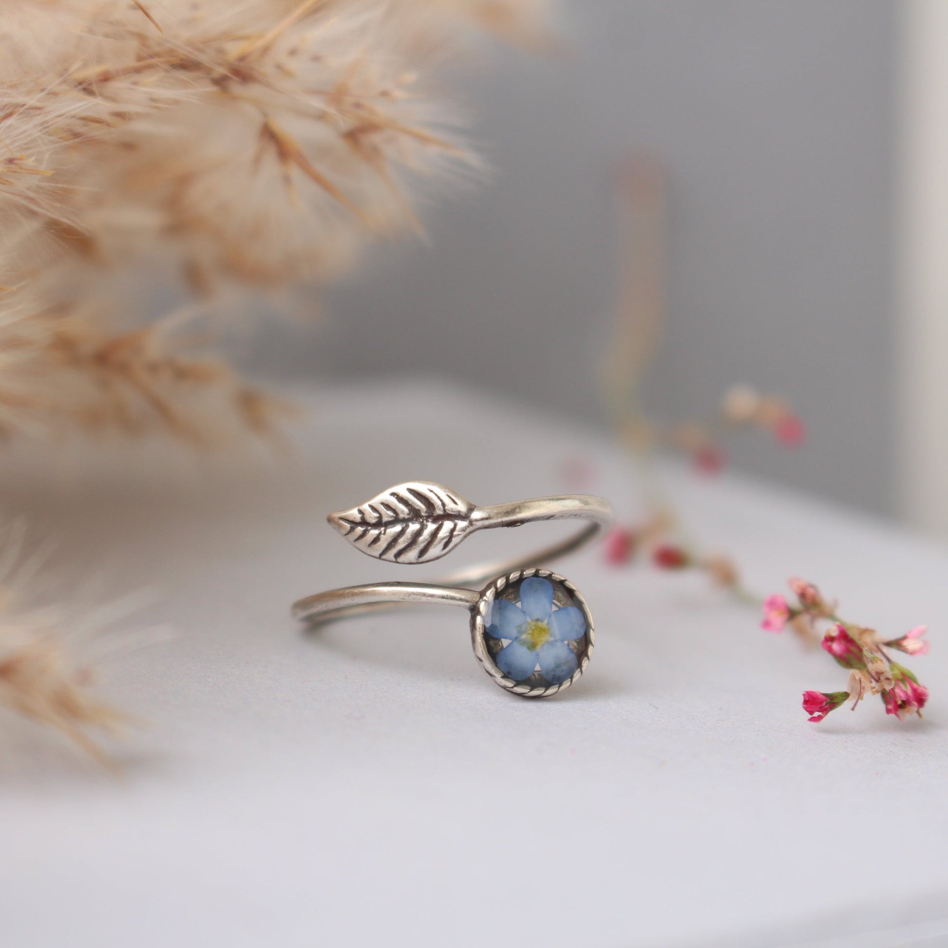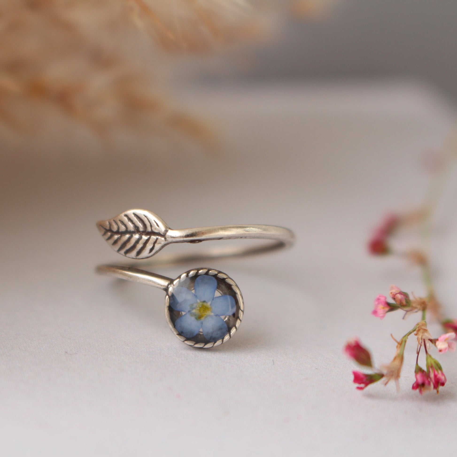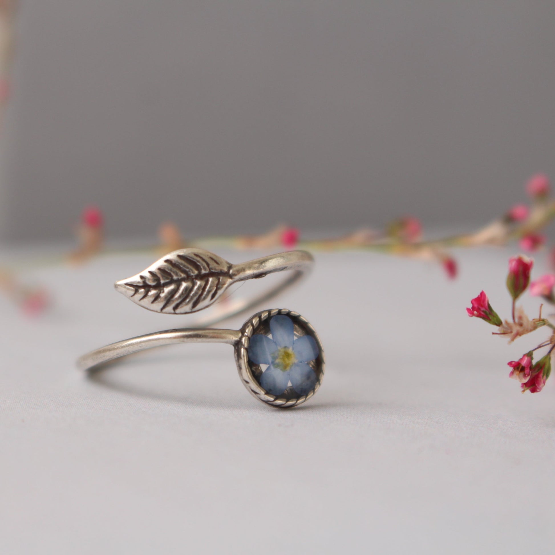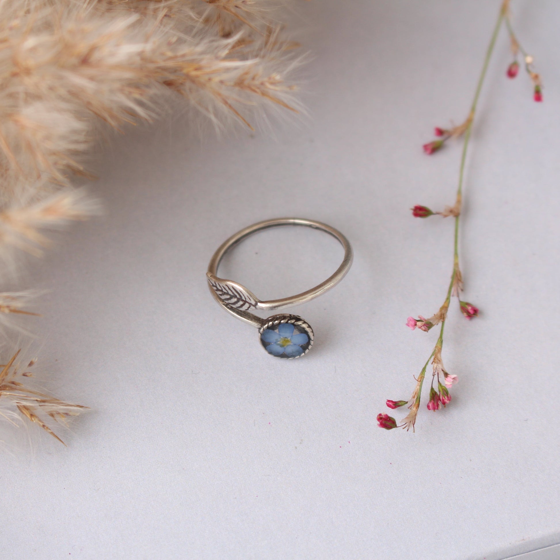 Նուրբ և բնությունից ներշնչված այս ձեռագործ մատանին պատրաստված է բնական անմոռուկ ծաղիկներով ՝ հավերժ պահպանված թափանցիկ խեժի մեջ։
