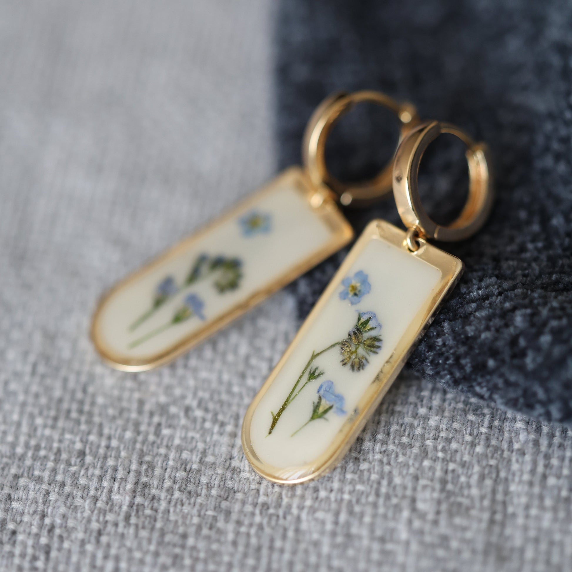 Ռոմանտիկ ոճի այս ձեռագործ ականջօղերը պատրաստված են բնական անմոռուկ ծաղիկներով ։