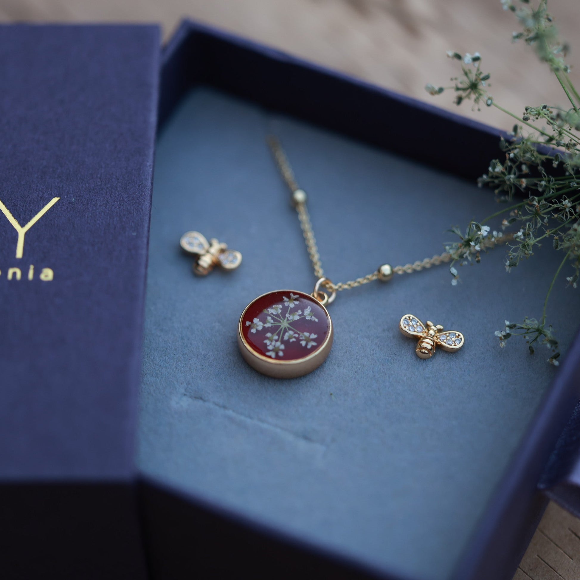 Վզնոցը ձեռագործ է , պատրաստված բնական ծաղիկներից և բարձրորակ թափանցիկ խեժից։ Իսկ փոքրիկ մեղուները կերպարին ավելացնում են նուրբ, բայց էլեգանտ շեշտադրում։ Հավաքածուն ներառում է նաև նուրբ գնդիկավոր շղթան ՝ պատրաստված ոսկեջրած լատունից, որը չի գունաթափվում կամ խամրում։