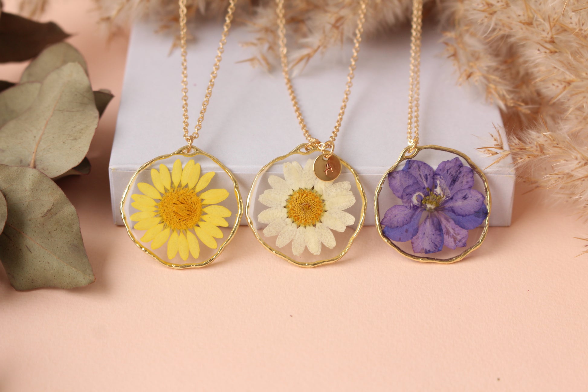 Ընտրիր սպիտակ Երիցուկ, դեղին Երիցուկ կամ մանուշակագույն Լարկսպուռ, յուրաքանչյուրը մշակված և պահպանված բյուրեղյա խեժի նուրբ շերտով։