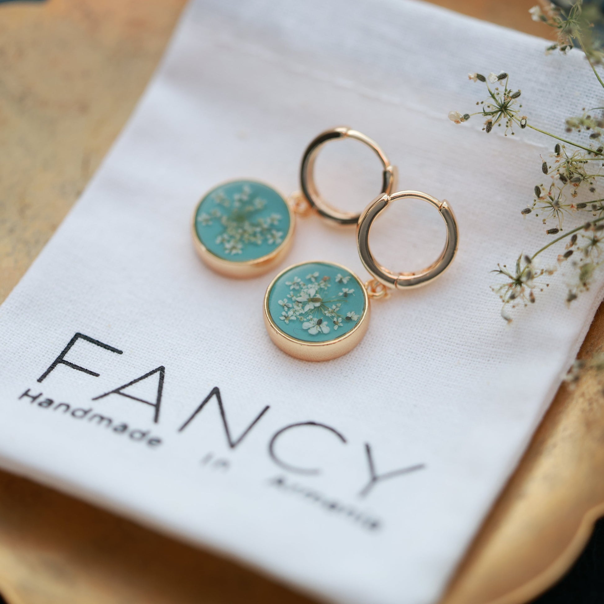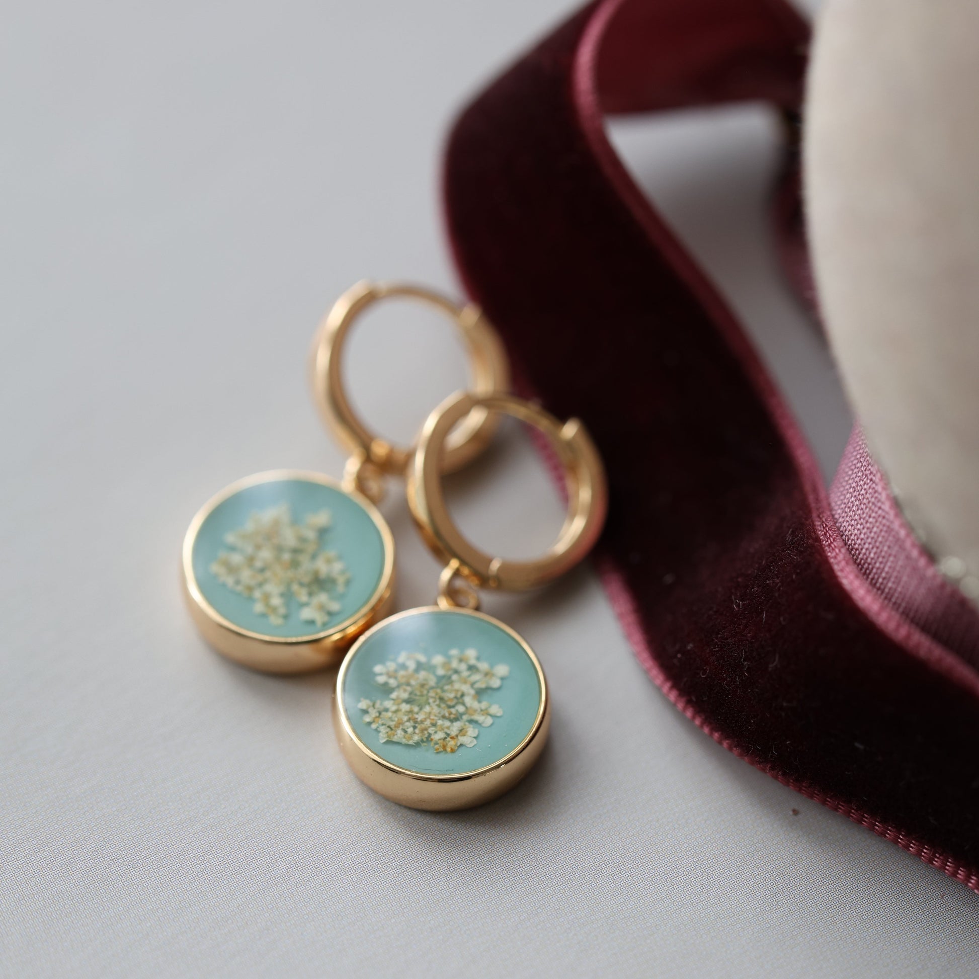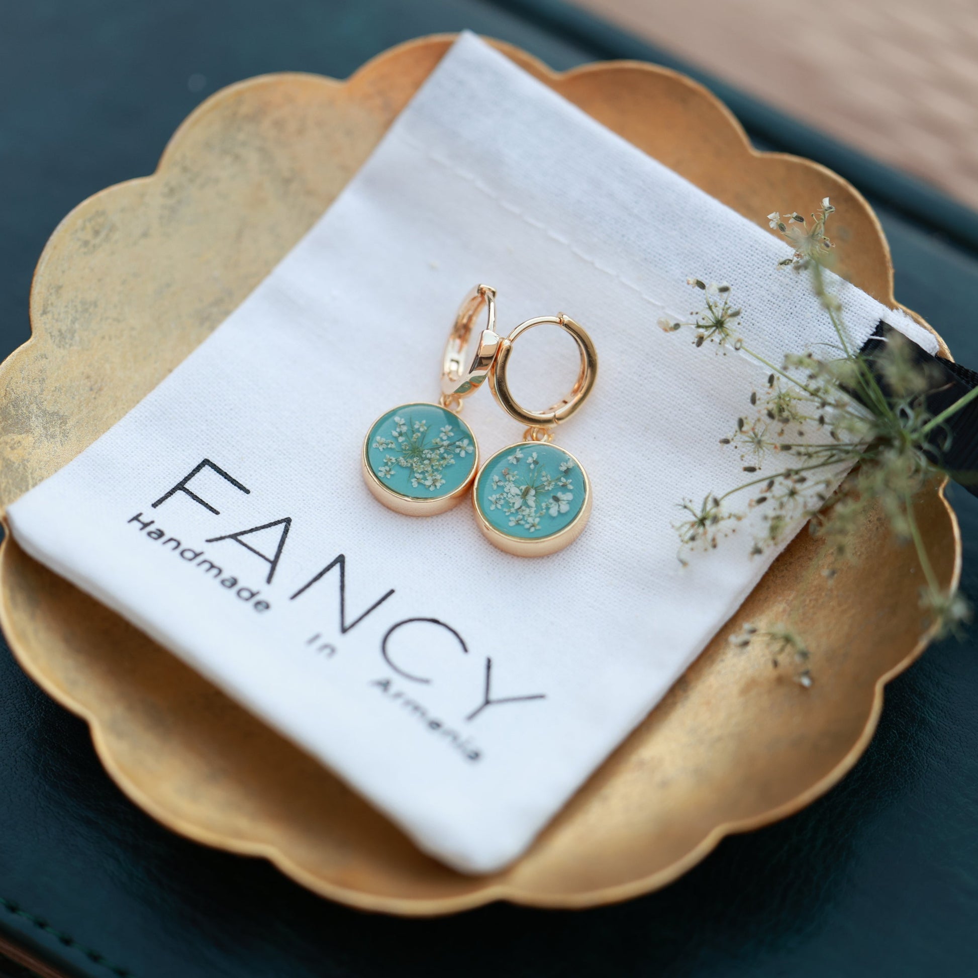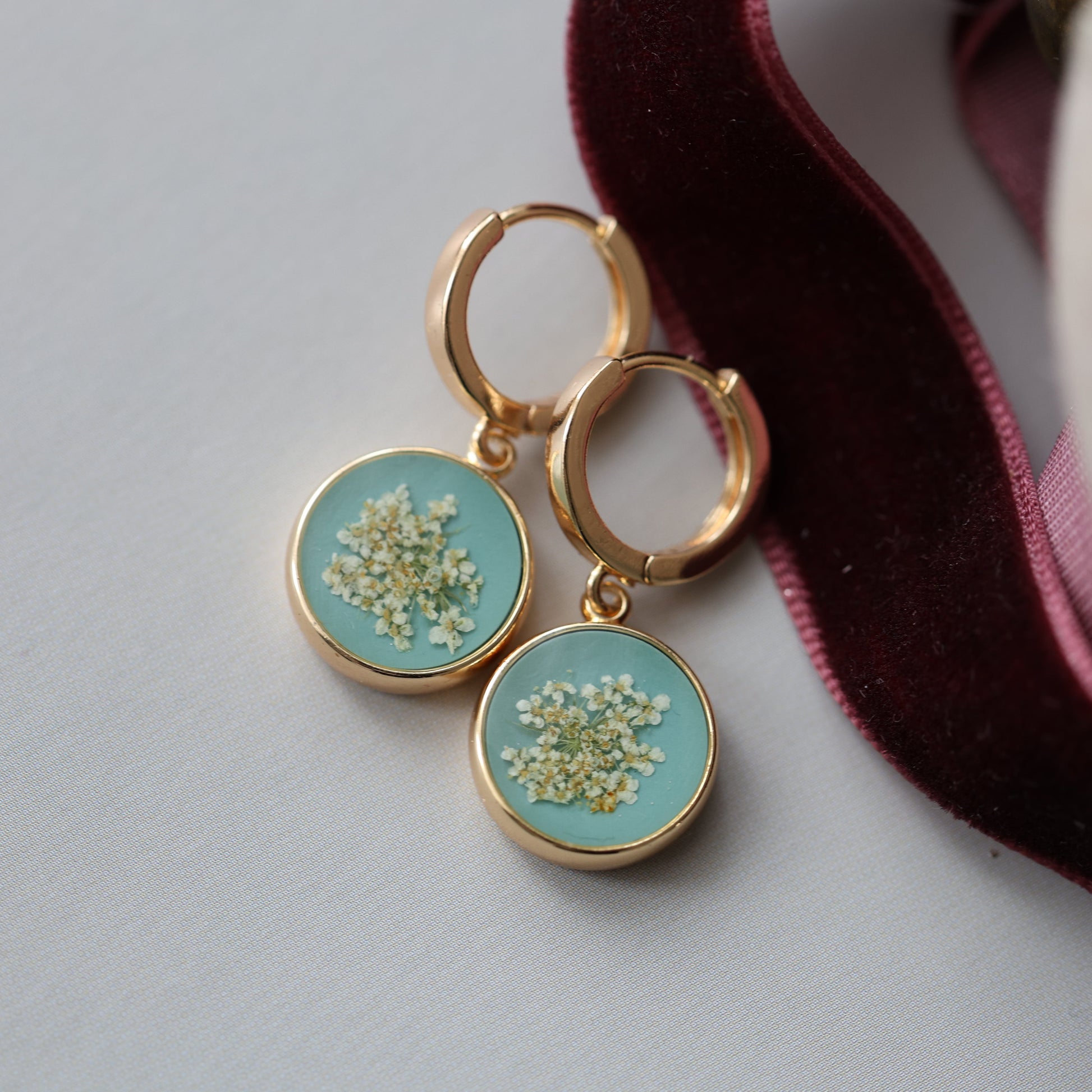 Նուրբ ձեռագործ ականջօղեր ՝ պատրաստված իրական Queen Anne's Lace ծաղիկներից, որոնք ծածկված են բյուրեղյա խեժի նուրբ ծածկույթով, իսկ հիմքի փիրուզագույնը ընդգծում է նրանց բնական գեղեցկությունն ու թեթևությունը։