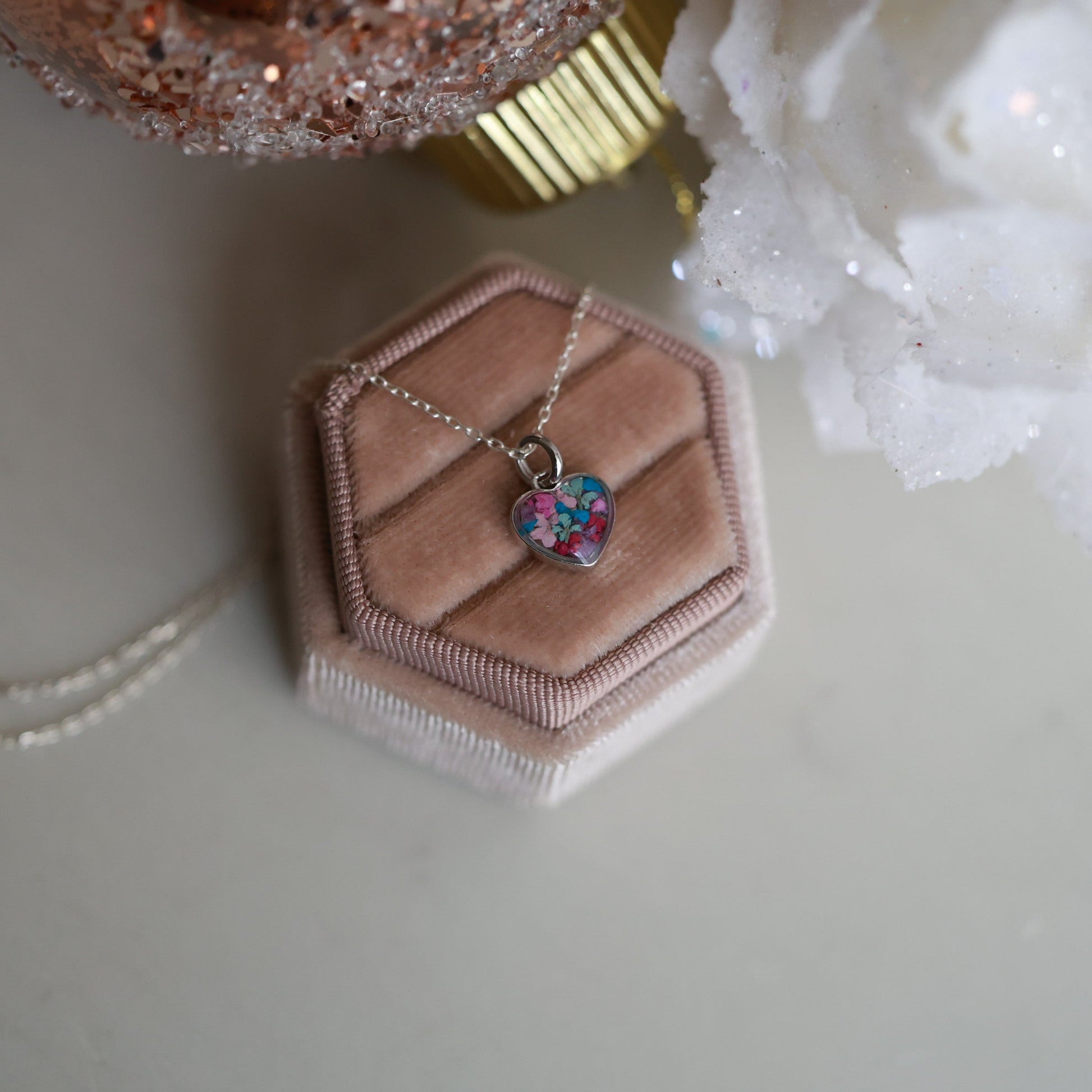 Carry a piece of nature close to your heart with this handmade sterling silver necklace, featuring a tiny heart filled with real preserved flowers. Its colorful minimalist design makes each pendant truly one-of-a-kind, blending delicate natural beauty with elegant simplicity.