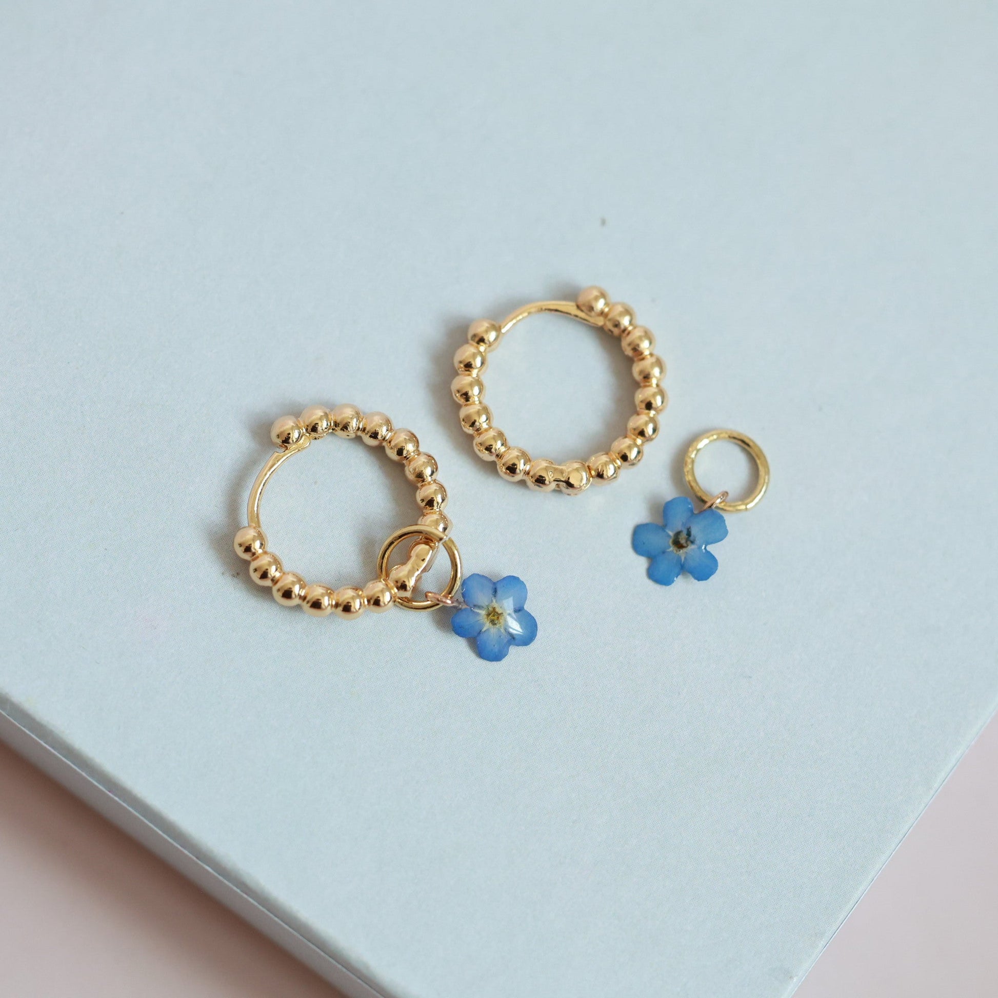 These gold-plated hoops come with a tiny real forget-me-not charm, carefully preserved to keep its soft blue color and natural beauty.
