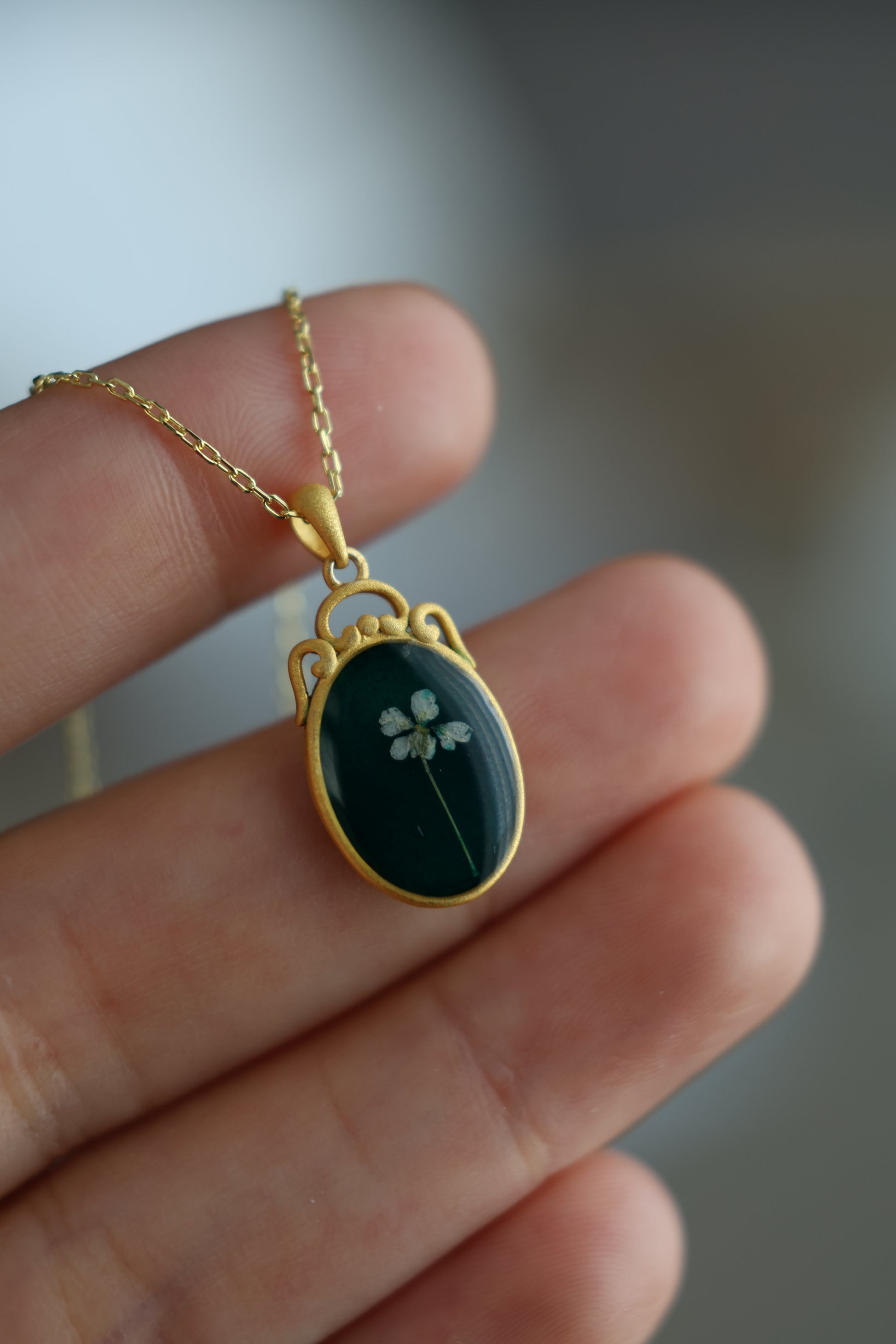 The beautiful flower inside of necklace is Queen Anne's lace.